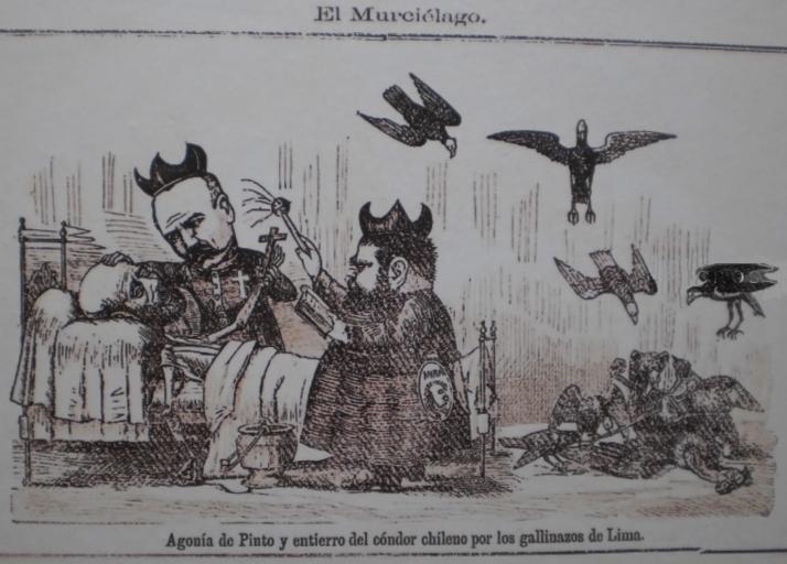 Keywords: El Murciélago nº 30. Lima 30 de julio de 1879.png es Agonía de Pinto y entierro del cóndor chileno por los gallinazos de Lima El Murciélago nº 30 Lima 30 de julio de 1879 p 127 Xilografía sobre papel Aníbal Pinto agoniza acompañado de los escritores Vicuña Mackenna y Rafael Vial A un lado los gallinazos de Lima derrotan al símbolo de Chile http //guillermoamoros wordpress com/2009/01/24/imagenes-de-la-guerra-contra-chile-renzo-babilonia-fernandez-baca/ Magazine El Murciélago nº 30 Lima 30 de julio de 1879 p 127 1879 PD-old Image has a water mark from blog Peruvian Caricatures in the War of the Pacific Anibal Pinto Caricatures of politicians of Chile Benjamín Vicuña Mackenna |