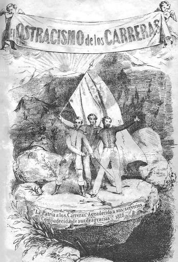| Keywords: El Ostracismo de los Carrera.jpg en The Carrera brothers from left to right Luis José Miguel and Juan José es Los hermanos Carrera desde izquierda a derecha Luis José Miguel y Juan José http //www memoriachilena cl/temas/documento_detalle asp id MC0009047 El Ostracismo de los Carreras Augusto Beaubeuf El Ostracismo de los Carrera pp 544 1857 PD-Art Books from Chile José Miguel Carrera Hermanos Carrera | ||||