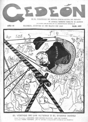 | Keywords: El vértigo de las alturas o el eterno Isidro, de Xaudaró.jpg  El vértigo de las alturas o el eterno Isidro en la revista satírica española Gedeón 1905-05-18 Gedeón El vértigo de las alturas o el eterno Isidro 495 1 http //prensahistorica mcu es/es/catalogo_imagenes/grupo cmd interno S posicion 1 path 4057557 presentacion pagina date 1905 5 18 1889-8734 Creator Joaquín Xaudaró PD-Scan PD-old-auto-1923 1933 Caricatures by Joaquín Xaudaró in Gedeón Raimundo Fernández Villaverde caricatures 1905 in Spain Political cartoons of Spain |