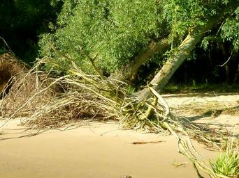 Keywords: elbe beach walk on the beach tree uprooted root plant sand summer sunny river landscape nature green bank northern germany ebb