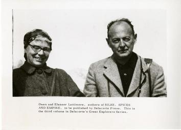 | Keywords: smithsonian institution smithsonianinstitution woman man husband wife asia northwestern author travel smithsonian institution archives smithsonianinstitutionarchives women's history month womenshistorymonth women in science womeninscience 2011 academia asian studies asianstudies 20th century - mid 20thcenturymid people groupshot monochrome Subject: Lattimore, Eleanor Holgate 1895-1970        Lattimore, Owen 1900-1989        Northwestern University (Evanston, Ill.) Type: Black-and-White Prints Topic: International relations Local number: SIA Acc. 90-105 [SIA-SIA2008-5125] Summary: East Asia expert Eleanor Holgate Lattimore (1895-1970) and her husband Owen Lattimore (1900-1989), shown here in publication publicity for their new book Silks, Spices, and Empire (Delacorte Press, 1968). After graduating from Northwestern University in 1915, Eleanor Holgate had studied and taught in China. The Lattimores married in 1925 and she later described their fantastic wedding journey from Peking to India in Turkestan Reunion (1934). Cite as: Acc. 90-105 - Science Service, Records, 1920s-1970s, Smithsonian Institution Archives Persistent URL:Link to data base record Repository:Smithsonian Institution Archives View more collections from the Smithsonian Institution. Subject: Lattimore, Eleanor Holgate 1895-1970 Lattimore, Owen 1900-1989 Northwestern University (Evanston, Ill.) Type: Black-and-White Prints Topic: International relations Local number: SIA Acc. 90-105 [SIA-SIA2008-5125] Summary: East Asia expert Eleanor Holgate Lattimore (1895-1970) and her husband Owen Lattimore (1900-1989), shown here in publication publicity for their new book Silks, Spices, and Empire (Delacorte Press, 1968). After graduating from Northwestern University in 1915, Eleanor Holgate had studied and taught in China. The Lattimores married in 1925 and she later described their fantastic wedding journey from Peking to India in Turkestan Reunion (1934). Cite as: Acc. 90-105 - Science Service, Records, 1920s-1970s, Smithsonian Institution Archives Persistent URL:Link to data base record Repository:Smithsonian Institution Archives View more collections from the Smithsonian Institution. |