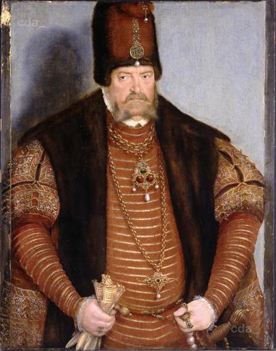 Keywords: Elector Joachim II of Brandenburg (DE SPSG GKI1113).jpg watermark Artwork Creator Lucas Cranach d J de die Pelzmütze ist mit einem Christusmongramm his verziert in der linken Hand hält er einen Rosenkranz en The painting depicts Elector Joachim II of Brandenburg as an almost life-size half-length figure against a light background The sable hat is decorated with the monogram of Christ his Joachim wears two chains with pendants around his neck holds a rosary in his left hand and has a ring on his finger ca 1570 oil lime panel cm 112 2 88 institution Jagdschloss Grunewald Hans-Joachim Giersberg Preußens Glanz Königsschlösser in Berlin und Brandenburg Munich 2007 p 8 object history de 1699 vermutlich im Potsdamer Stadtschloss; - 1793 nachweislich im Berliner Schloss Potsdam City Palace in 1699 - evidently in the Berlin Palace in 1793 credit line de 1563 verkündete Joachim II sein lutherisches Glaubensbekenntnis hier ist er nicht als protestantischer Fürst dargestellt 1569 erfolgte nach Verhandlungen mit dem polnischen König die Mitbelehnung mit dem Herzogtum Preußen In dem hohen und ungewöhnlichen Pelzhut sieht Forschung ein polnisches Kleidungsstück mit dem Joachim II möglicherweise die enge Verbindung zu seinem Schwager dem polnischen König Sigismund II August betonen wollte Sigismund II Augustus Joachim was co-enfoeffed with the Duchy of Prussia The striking fur hat worn by Joachim has been interpreted by some researchers as a Polish item of apparel possibly intended to manifest his close connection with the Polish throne accession number DE SPSG GKI1113 http //lucascranach org/DE_SPSG_GKI1113 Cranach Digital Archive <gallery>Image Joachim II Brandenburg png</gallery> PD-old-100-1923 DEFAULTSORT Cranach Lucas 2; Joachim II of Brandenburg; Jagdschloss Grunewald Portrait paintings by Lucas Cranach the Younger Paintings by Lucas Cranach the Younger with fur Joachim II of Brandenburg Fur fashion in 1570 IHS in Germany Paintings in Jagdschloss Grunewald Portrait paintings with blue background Sable clothing in art Sable headgear in art 1570s paintings in Berlin 1570s portrait paintings Images uploaded by Fæ |