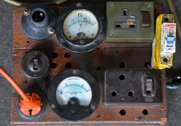 Keywords: electric board dials plugs board electric control button switch equipment design electrical display technology panel indicator clock device meter gauge measure system power mechanism old measurement vintage retro industrial nobody grunge