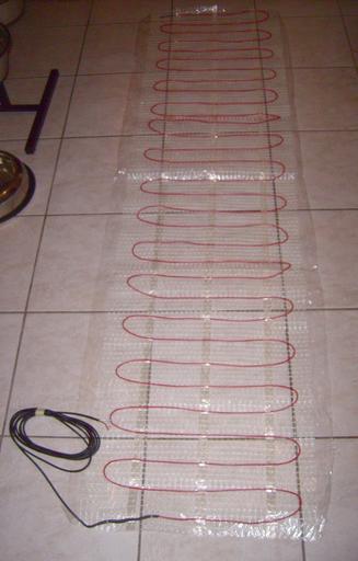 Keywords: Electric floor heating fussbodenheizung.jpg en electric floor heating de elektrische Fussbodenheizung 1 m² Flächenheizelement nach EN 60335-1 und EN 60335-2-96 <br /> 2 00 m lang x 0 50 m breit <br /> 230 V 155 W 354 Ohm <br /> Nenngrenztemperatur 90°C <br /> Elektrische Schutzart IP X7 Schutz gegen zeitweiliges Untertauchen <br /> vor der Verlegung; muss in wärmeleitfähiges Material eingebracht werden also in Estrichbeton Ausgleichsmasse oder Fliesenkleber own Hundehalter 2010-12-07 Cc-zero Underfloor heating |
