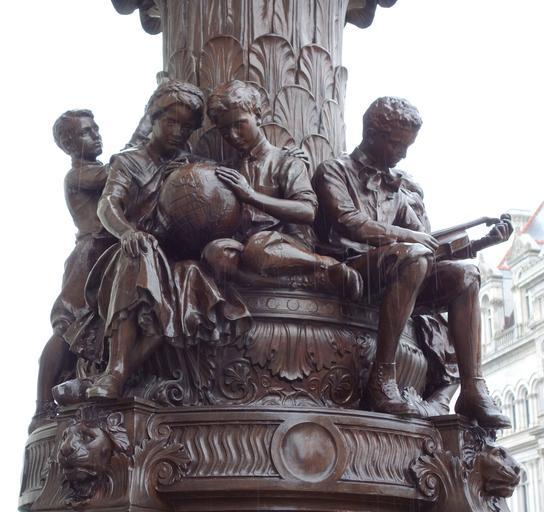 | Keywords: Electroliers, New York State Education Department Building - DSC08337.JPG Two electroliers or street lamps flank the entrance to a building They have the same design except the one depicts children studying; the other children relaxing after play Both electroliers are topped by a 20 inch-high hexagonal lamp encircled by smaller dome-shaped lights Below each light is an owl holding a garland of flowers in its beak The children appear at the base of the shaft with lion's heads below them On the right lamp nine children are seen studying dressed in school clothes They are seen reading writing counting examining a globe and holding a violin On the left lamp the children holding various toys including a doll a football a hoop a small boat a teddy bear a baseball bat and glove a tennis racket and ball and roller skates Both lamps have a brown patina This artwork is in the public domain because first published in the United States before 1923 2013-06-13 12 32 44 own Daderot cc-zero Electroliers New York State Education Department Building Uploaded with UploadWizard |