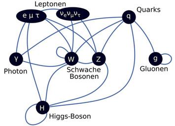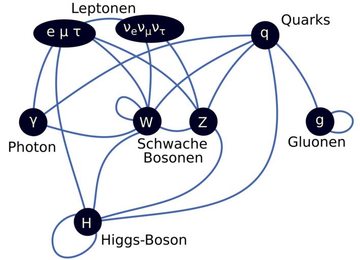 Keywords: Elementary particle interactions-de.svg Version with german text cleaned up source code A diagram summarizing the tree-level interactions between elementary particles described in the Standard Model Vertices darkened circles represent types of particles and edges blue arcs connecting them represent interactions that can take place The organization of the diagram is as follows the top row of vertices leptons and quarks are the matter particles; the second row of vertices photon W/Z gluons are the force mediating particles; and the bottom row is the Higgs boson en Image Elementary particle interactions svg 2007-01-14 2008-02-03 2016-06-28 en User TriTertButoxy User Stannered User Doktorchen <gallery> File Elementary particle interactions svg English version </gallery> Standardmodell |