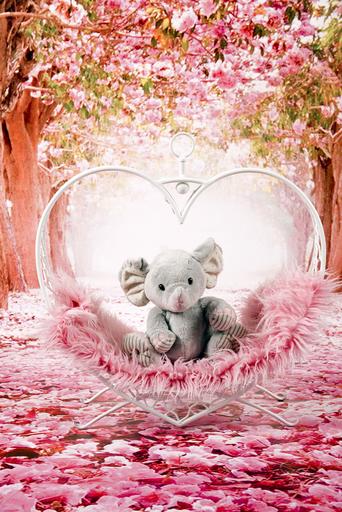Keywords: elephant heart plush vertical toy studio gray pink the background tree flowers foliage the buds flourishing sitting the mascot posing for children