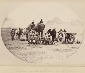 Keywords: Elephant and Mule Battery ("Dignity & Impudence") WDL11496.png Artwork ru Бе к Джон уме в 1900 году fr Burke John mort en 1900 en Burke John died 1900 zh 约翰·伯克,卒于 1900 年 pt Burke John falecido em 1900 ar بيرك، جون، توفي 1900 es Burke John fallecido en 1900 ru Г уппа слонов и мулов Достоинство и наглость fr Batterie d'éléphants et de mules « Dignité et impudence » en Elephant and Mule Battery Dignity Impudence zh 大象与骡子炮台( 尊严与 辱 ) pt Elefantes e mulas de carga dignidade e impudência ar سرية من الفيلة والبغال الكرامة والوقاحة ru Эта фотог афия г уппы слонов и мулов входит в альбом едких исто ических фотоснимков на кото ых изоб ажены люди и места связанные со Вто ой англо-афганской войной Г уппа мулов в левой части фотог афии пе евозила п ипасы или тащила небольшое полевое о удие а слоны использовались для т анспо ти овки более к упного о удия Военнослужащие на снимке п едставлены смешанным составом из б итанских солдат и индийских сипаев Г уппа солдат стоящих на коленях вок уг небольшого полевого о удия за яжаемого с дульной части готовится п оизвести выст ел после того как стоящий спе еди слева солдат п ибойником затолкает за яд в о удие Шутливая подпись к исунку основана на асп ост аненных сте еотипах о слонах достоинство и мулах наглость Вто ая англо-афганская война началась в нояб е 1878 года когда Великоб итания опасаясь как ей казалось астущего влияния России в Афганистане вто глась в эту ст ану с те ито ии Б итанской Индии Пе вый этап войны закончился в мае 1879 года подписанием Гандамакского догово а позволившего афганцам сох анить внут енний суве енитет однако заставившего их уступить конт оль над внешней политикой своей ст аны б итанцам Военные действия возобновились в сентяб е 1879 года после антиб итанского восстания в Кабуле и окончательно заве шились в сентяб е 1880 года ешающей битвой за Кандага Данный альбом включает по т еты б итанских и афганских лиде ов и военнослужащих фотог афии п остых афганских людей изоб ажения б итанских военных лаге ей военных действий ст оений пейзажей к упных и небольших го одов Все изоб аженные на фотоснимках места находятся на те ито ии сов еменных Афганистана или Пакистана в то в емя бывших частью Б итанской Индии Около т ети п едставленных в альбоме фотог афий выполнены Джоном Бе ком около 1843 1900 гг д угая т еть  сэ ом Бенджамином Симпсоном 1831 1923 гг а оставшаяся часть  несколькими д угими фотог афами Авто ы некото ых фотоснимков неизвестны Возможно что составителем альбома был один из членов б итанского п авительства в Индии однако это п едположение не подтве ждено Каким об азом альбом попал в Библиотеку Конг есса неизвестно <br>Афганские войны; Пушки; Слоны; Великоб итания А мия; улы; Солдаты fr Ce cliché d'une batterie d'éléphants et de mules est extrait d'un album de photographies historiques rares de personnalités et de sites associés à la seconde guerre anglo-afghane Les mules à gauche de la photographie étaient chargées de transporter l'équipement ou de tracter le petit canon de campagne tandis que les éléphants devaient traîner le grand canon Les hommes photographiés sont des soldats britanniques et des cipayes indiens Le groupe agenouillé autour du petit canon à chargement par la bouche se prépare à tirer une fois que le soldat devant à gauche aura chargé le canon à l'aide de l'écouvillon visible dans sa main La légende humoristique évoque les stéréotypes courants sur les éléphants « dignité » et les mules « impudence » La seconde guerre anglo-afghane commença en novembre 1878 lorsque la Grande-Bretagne se sentant menacée par l'influence croissante des Russes en Afghanistan envahit le pays depuis l'Inde britannique La première phase de la guerre s'acheva en 1879 avec le traité de Gandamak qui permit aux Afghans de conserver leur souveraineté nationale mais les força à céder le contrôle de leur politique étrangère aux Britanniques Les combats reprirent en septembre 1879 à la suite d'un soulèvement antibritannique à Kaboul et ils se conclurent finalement en septembre 1880 avec la bataille décisive de