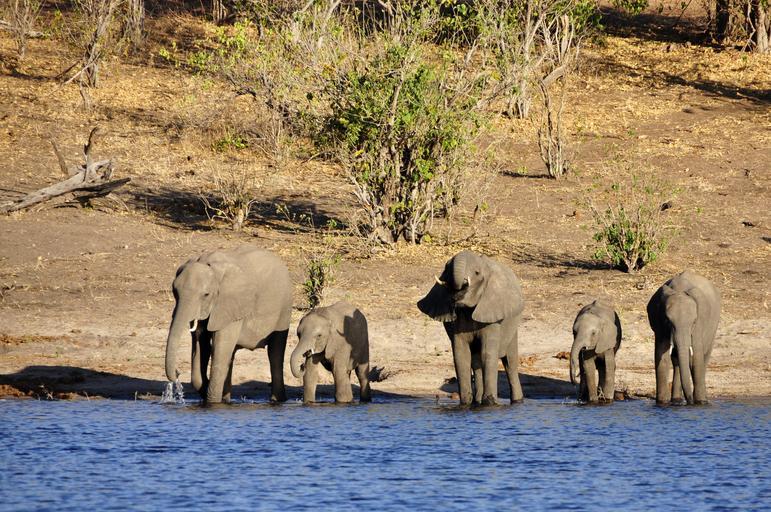 Keywords: elephant water elephant elephant calf family drink river water chobe botswana africa animal wild safari green grey