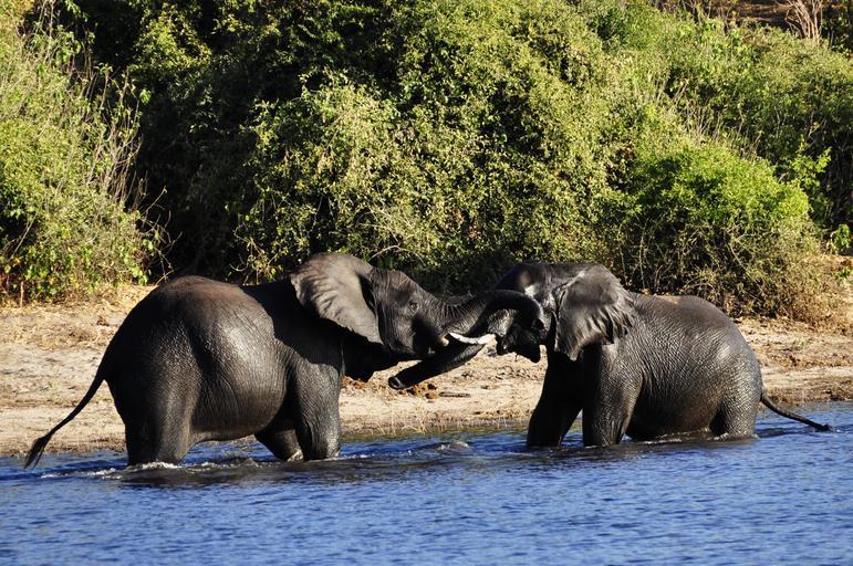 Keywords: elephant water elephant fight rivals river water chobe botswana africa animal wild safari green grey