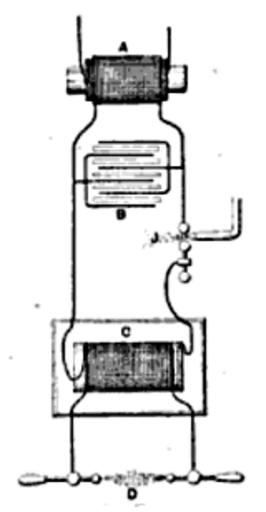| Keywords: Elihu Thomson's Tesla coil circuit Feb 1892.png Tesla coil circuit invented by Elihu Thomson and published in February 1892 The Tesla coil was a spark-excited resonant transformer circuit invented by Serbian American inventor Nikola Tesla and patented by him US patent 454 622 April 25 1891 which produced very high voltage high frequency current However many sources confirm that Tesla was not the first to invent this circuit Although this circuit was published a year after Tesla's invention Thomson claimed to have been experimenting with similar circuits in 1890 including one which could produce 60 inch sparks and many other sources confirm this This circuit essentially identical to Tesla's circuits of the time consists of A high voltage step-up transformer producing 15-20 kV b primary capacitor J spark gap with compressed air blowout to prevent it from arcing continuously C air-core resonant transformer consisting of a 15-20 turn helix of heavy wire surrounded by a glass cylinder on which are wound 150 turns of fine wire immersed in a tank of oil for insulation D output spark gap Thomson wrote that the output voltage was 150 000 volts but was limited only by the coil insulation 1892-11-20 Retrieved November 21 2015 from https //books google com/books id JUtEAQAAIAAJ pg PA117 dq thomson Elihu Thomson Induction by high potential discharges in Electrical World magazine W J Johnson Co New York Vol 19 No 8 February 20 1892 p 117 fig 7 on Google Books Elihu Thomson Thomson died in 1937 other versions Elihu Thomson's Tesla coil circuit Feb 1892 rotated png rotated version PD-old-70-1923 Tesla coils Tesla coil circuits |