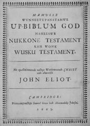 | Keywords: Eliot Bible 1663.jpg en Title-page frome the Eliot Bible printed by Samuel Green and Marmaduke Johnson about 1663 Copy of the Pennsylvania University Library ru Титульный лист из Библии Элиота напечатанной Сэмюэлем Г ином и а мадьюком Джонсоном в 1663 году Экземпля из Пенсильванской униве ситетской библиотеки http //www library upenn edu/exhibits/rbm/kislak/religion/eliotbible html Samuel Green; Marmaduke Johnson 1663 PD-old-100 1663 books | ||||