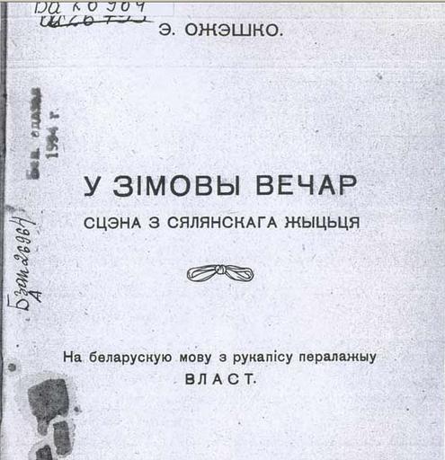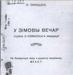 | Keywords: Eliza Orzeszkowa - W zimowy wieczór (przekład białoruski).jpg en Belarusian translation of the Eliza Orzeszkowa's novel «W zimowy wieczór» In the winter evening be-tarask Эліза Ажэшка У зімовы веча вокладка бела ускі пе аклад http //prajdzisvet org/text/724-hiedali html Creator Eliza Orzeszkowa 1907 PD-old-100 Eliza Orzeszkowa Belarusian classical orthography | ||||