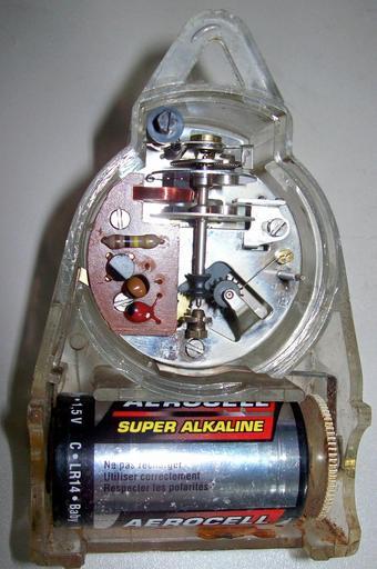 Keywords: Elmechuhr.jpg en Electromechanical clock The balance wheel vertical axle center has permanent magnets and is driven by a solenoid coil red upper left powered by the battery de elektromechanische Uhr Unruh mit Magneten wird durch eine Spule angetrieben und treibt die Uhr an own Ulfbastel 2008-07-25 PD Electric clockworks |