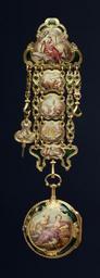 | Keywords: Eloy Brichard - Chatelaine and Watch - Walters 58151.jpg Appearing on the sections of the enameled chatelain in descending order are the Muse Urania; emblems of architecture sculpture drawing and painting; and the Muse Calliope On the watch case the enamel shows a woman with arm extended as she paints a portrait of a man on an oval medallion She is surrounded by amorini watchcase 1761 gold painted enamel cm 4 5 accession number 58 151 19459 Henry Walters Baltimore date and mode of acquisition unknown Walters Art Museum Henry Walters Acquired by Henry Walters Jewelry - Ancient to Modern The Walters Art Gallery Baltimore 1979-1980 Objects of Vertu Precious Works of the Eighteenth Century The Walters Art Gallery Baltimore 1984 place of origin Paris France Walters Art Museum license Collections of the Walters Art Museum Media contributed by the Walters Art Museum needs artist review Painted enamel art in the Walters Art Museum Chatelaines |