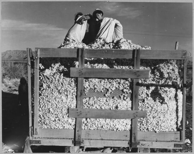 | Keywords: Eloy District, Pinal County, Arizona. Migratory cotton pickers dump their sacks into the field wagon . . . - NARA - 522255.jpg Scope and content Full caption reads as follows Eloy District Pinal County Arizona Migratory cotton pickers dump their sacks into the field wagon Wages - 75 per hundred pounds Late afternoon General notes 522255 Local identifier 83-G-44086 Department of Agriculture Bureau of Agricultural Economics Division of Economic Information ca 1922 - ca 1953 NARA-Author Lange Dorothea 1895-1965 Photographer 1372774 <br /> Still Picture Records Section Special Media Archives Services Division NWCS-S National Archives at College Park 8601 Adelphi Road College Park MD 20740-6001 11/1940 Record group Record Group 83 Records of the Bureau of Agricultural Economics 1876 - 1959 Record group ARC 412 Photographic Prints Documenting Programs and Activities of the Bureau of Agricultural Economics and Predecessor Agencies compiled ca 1922 - ca 1947 documenting the period ca 1911 - ca 1947 Series ARC 521048 File unit File unit ARC Variant control numbers NAIL Control Number NWDNS-83-G-44086 Other versions <gallery> File Eloy_District _Pinal_County _Arizona _Migratory_cotton_pickers_dump_their_sacks_into_the_field_wagon_ _ _ _-_NARA_-_522255 tif tif File Eloy_District _Pinal_County _Arizona _Migratory_cotton_pickers_dump_their_sacks_into_the_field_wagon_ _ _ _-_NARA_-_522255 jpg jpg </gallery> NARA-cooperation PD-USGov Dorothea Lange Eloy Arizona 1940 in Arizona November 1940 in the United States Cotton sacks Wagons in the United States Agricultural transport Agricultural workers Men at work in the United States |