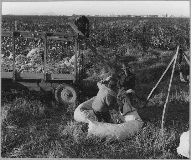 | Keywords: Eloy District, Pinal County, Arizona. Man and wife, migratory cotton pickers, at cotton wagon in the . . . - NARA - 522269.jpg Scope and content Full caption reads as follows Eloy District Pinal County Arizona Man and wife migratory cotton pickers at cotton wagon in the late afternoon She is taking off her cotton sack which she has hauled in from the field on her back It will be weighed after which he will climb the ladder and dump the cotton into the wagon Together they earn not 3 00 per day At this time of year November the working day is about 10 hours General notes 522269 Local identifier 83-G-44100 Department of Agriculture Bureau of Agricultural Economics Division of Economic Information ca 1922 - ca 1953 NARA-Author Lange Dorothea 1895-1965 Photographer 1372774 <br /> Still Picture Records Section Special Media Archives Services Division NWCS-S National Archives at College Park 8601 Adelphi Road College Park MD 20740-6001 11/1940 Record group Record Group 83 Records of the Bureau of Agricultural Economics 1876 - 1959 Record group ARC 412 Photographic Prints Documenting Programs and Activities of the Bureau of Agricultural Economics and Predecessor Agencies compiled ca 1922 - ca 1947 documenting the period ca 1911 - ca 1947 Series ARC 521048 File unit File unit ARC Variant control numbers NAIL Control Number NWDNS-83-G-44100 Other versions <gallery> File Eloy_District _Pinal_County _Arizona _Man_and_wife _migratory_cotton_pickers _at_cotton_wagon_in_the_ _ _ _-_NARA_-_522269 tif tif File Eloy_District _Pinal_County _Arizona _Man_and_wife _migratory_cotton_pickers _at_cotton_wagon_in_the_ _ _ _-_NARA_-_522269 jpg jpg </gallery> NARA-cooperation PD-USGov Dorothea Lange Eloy Arizona Farms in Arizona Cotton sacks Cotton fields in the United States Agricultural vehicles Wagons in the United States Men and women at work 1940 in Arizona November 1940 in the United States Agricultural workers Weighing scales in the United States Ladders |