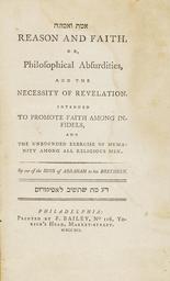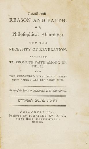 | Keywords: Emet ve-Emunah Reason and Faith.jpg en Emet ve-Emunah Reason and Faith Joshuah Hezekiah DeCordova Philadelphia F Bailey 1791 Joshua Hezekiah DeCordova 1720-1797 served as a preacher and religious teacher in his native Amsterdam and in Curacao In 1755 he was appointed the Rabbi of the prominent Jewish community in Jamaica a position he retained for more than forty years until his death A staunch traditionalist DeCordova consistently endeavored to ensure the spiritual welfare of his congregants In a 1758 communication to the leaders of New York's Jewish community he admonished them to be more stringent in guarding the kashrut of the meat they exported to Jamaica Three decades later he published Reason and Faith a defense of revealed religion against modern philosophers who destroy all principles of faith and virtue A polemic directed against Deists and freethinkers this work was quickly imported into the North American continent where it was quickly reprinted first in the present edition and then again in 1804 As the first Jewish work of its kind published in North America its title page also contained two lines of Hebrew type The first line of Hebrew reads Emet ve-Emunah a fair translation of the English title Reason and Faith though Emet is probably better rendered as Truth The second Hebrew line more strident in tone seems to encourage the reader to rise to the defense of traditional faith This line reprises the ancient rabbinic dictum Da Ma she-Tashiv la-Apikorus know what you will respond to the heretic first quoted in the Mishnah Avot 2 14 that enjoins the arming of oneself with sufficient knowledge to combat those who deny traditional beliefs 1791 http //www sothebys com/en/auctions/ecatalogue/2010/important-judaica-n08691/lot 172 html Sotheby's Joshuah Hezekiah DeCordova other versions PD-Art Jewish philosophy and ethics |