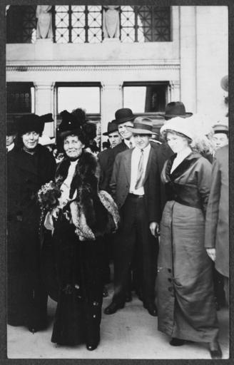 | Keywords: Emmeline Pankhurst, in furs at center, 276003v.jpg Emmeline Pankhurst in furs at center on her speaking tour in United States 1913 Lucy Burns is to the left Frederick A Schutz Washington D C Photographer ca 1914 Summary Photograph of Lucy Burns left in coat and hat and Emmeline Pankhurst center wearing feathered hat fur stole and fur muff with a third woman right and crowd of men likely taken during Pankhurst's October 1913 speaking tour of the United States Title transcribed from item Also on verso Left to Right- Miss Lucy Burns Mrs Pankhurst just released from a hunger strike London Eng 1 postcard 3 5 x 5 5 in accession number Call Number Location National Woman's Party Records Group II Container II 276 Folder Group Photographs Nos 1-7 Source Collection Records of the National Woman's Party institution Library of Congress Manuscript Division http //hdl loc gov/loc mss/mnwp 276003 PD-old suffragettes Lucy Burns Emmeline Pankhurst Interior of Union Station Washington D C Fur fashion in 1914 |