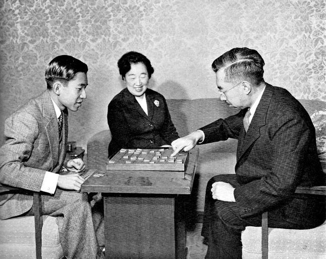 | Keywords: Emperor Showa & Empress Kojun & Prince Akihito playing Shogi 1955-1.jpg ja 将棋を楽し 昭和天皇・皇太子明仁親王と香淳皇后 天皇家の生活 毎日新聞社 宮内庁 1955-01 PD-Japan-oldphoto Emperor Hirohito in 1955 Empress Kōjun Emperor Akihito Shogi players Black and white photographs of Japan in the 1950s Black and white photographs of shogi |