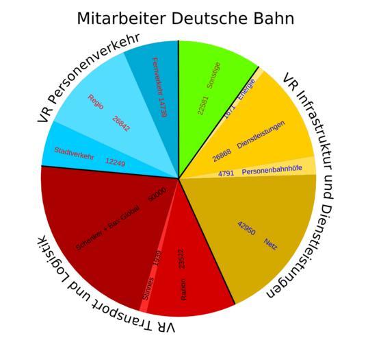 | Keywords: Employees Deutsche Bahn.svg en number of full time employees at Deutsche Bahn de Anzahl der in Vollzeit beschäftigten Mitarbeiter der Deutschen Bahn nach Geschäftsfeldern In Teilzeit Beschäftigte wurden zur besseren Vergleichbarkeit in Vollzeitpersonen umgerechnet Daten für Schenker und Bax vom 23 9 2006 alle anderen vom 31 12 2005 own work with data from Deutsche Bahn AG Hrsg http //www db de/site/shared/de/dateianhaenge/berichte/geschaeftsbericht__2005__konzern__high__res pdf Geschäftsbericht 2005 März 2006 S 93 Deutsche Bahn AG http //www db de/site/bahn/de/logistik/bahn__logistik/bax__goes__schenker/bax__goes__schenker html Bax goes Schenker 23 September 2006 2007-02-03 User Malte_Schierholz own work Rail transport diagrams of Germany SVG pie charts |