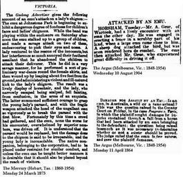 Keywords: Emu attacks 1864 1873 1904.jpg en from the http //www nla gov au/ndp/ National Library Australian newspapers digitisation program which are pre-1955 so no copyright The service includes newspapers published in each state and territory from the 1800s to the mid-1950s when copyright applies http //nla gov au/nla news-article10334173 http //nla gov au/nla news-article8920003 http //nla gov au/nla news-article5747338 The Argus The Mercury 1864 1873 1904 PD-Australia Emus in art National Library of Australia - Australian Newspapers Service