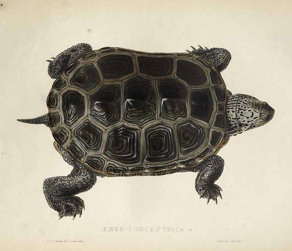Keywords: Emys concentrica Bell.jpg en Plate from A Monograph of the Testudinata by Thomas Bell http //www rarebookroom org/Control/beltda/index html Rare Books Room James de Carle Sowerby 1787 “1871 painting Edward Lear 1812-1888 lithograph 1832 1836 Thomas Bell zoologist Turtle paintings by Edward Lear James De Carle Sowerby Malaclemys terrapin PD-old-100 |