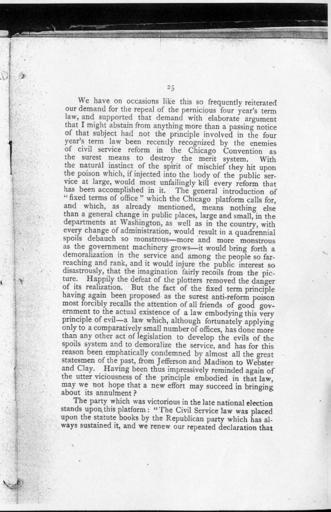 | Keywords: Encouragements and Warnings p25.JPG en Speech of National Civil Service Reform League president Carl Schurz before its annual meeting of December 10 1896 in Philadelphia p 25 Single page scan 200 dpi Carl Schurz Encouragements and Warnings National Civil Service Reform League 1896; courtesy of Boston Public Library Carl Schurz 1896-12-10 PD-Old Encouragements and Warnings Page Images | ||||