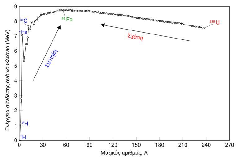 Keywords: Energy per nucleon vs A.svg en Nuclear binding energy curve el Ενέργεια σύνδεσης/νουκλεόνιο - αζικός αριθμός own Xhmikos Nuclear binding energy curves