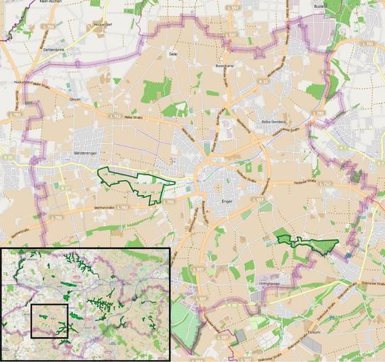 | Keywords: Enger - nature reserves.png Nature reserves in Enger - overview map<br/>Number and borders of nature reserves are subject to frequent change In order to facilitate reproduction of this map from openstreetmap the following data is stored here <br/> export boundaries north 52 175; west 8 49; east 8 62; south 52 1; mapnik svg scale 1 50 000<br/> nature reserve boundary stroke weight 3 5; <br/>nature reserve stroke color R 5 G 102 B 36; <br/>district border stroke weight 20 Naturschutzgebiete in Enger - Ã bersichtskarte Enger - vue d'ensemble Own based on http //www openstreetmap org/ Open Street Map 2011-05-05 Hagar66 Maps of Enger Cc-zero |