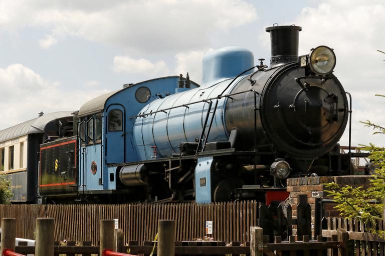 Keywords: engine steam rail railways vintage old blue carriages locomotive railway transportation travel track wheel smoke power industry classic nostalgia station historical museum