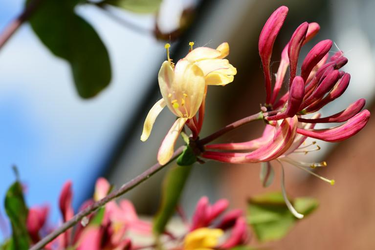Keywords: english honeysuckle nutmeg-cinnamon perfume woodbine lonicera periclymenum yellow-cream pink woody perennial climbing shrub plant flowering close-up detail