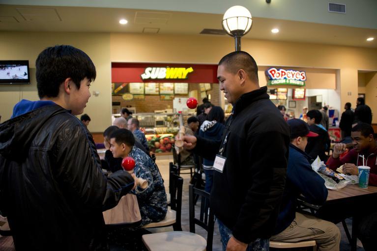 MAKE A MEME View Large Image English lesson 140204-N-TO330-036.jpg en Culinary Specialist 2nd Class Eleazar Sison plays kendama with a Terao Elementary School 5th grader as part of an English practice lesson at the Navy Exchange food court on Naval Air Facility Atsugi ...