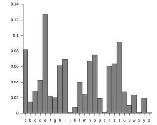 | Keywords: English letter frequency (alphabetic).svg mld Relativní četnosti písmen angličtiny seřazeno abecedně English letter frequencies sorted alphabetically own ; en Letter frequency Nandhp 2010-04-09 thumb left Sorted alphabetically thumb left Sorted by frequency gnuplot Generated with these files english-letter-frequency dat <pre> a 8 167 1 e 12 702 1 b 1 492 2 t 9 056 2 c 2 782 3 a 8 167 3 d 4 253 4 o 7 507 4 e 12 702 5 i 6 9662 5 f 2 228 6 n 6 749 6 g 2 015 7 s 6 327 7 h 6 094 8 h 6 094 8 i 6 966 9 r 5 987 9 j 0 153 10 d 4 253 10 k 0 772 11 l 4 025 11 l 4 025 12 c 2 782 12 m 2 406 13 u 2 758 13 n 6 749 14 m 2 406 14 o 7 507 15 w 2 360 15 p 1 929 16 f 2 228 16 q 0 095 17 g 2 015 17 r 5 987 18 y 1 974 18 s 6 327 19 p 1 929 19 t 9 056 20 b 1 492 20 u 2 758 21 v 0 978 21 v 0 978 22 k 0 772 22 w 2 360 23 j 0 153 23 x 0 150 24 x 0 150 24 y 1 974 25 q 0 095 25 z 0 074 26 z 0 074 26 </pre> english-letter-frequency gnuplot <pre> set term svg set key off set style fill solid 1 border -1 set tics out nomirror set border 3 set xrange 5 26 5 set output English letter frequency alphabetic svg set xtics a 1 b 2 c 3 d 4 e 5 f 6 g 7 h 8 i 9 j 10 k 11 l 12 m 13 n 14 o 15 p 16 q 17 r 18 s 19 t 20 u 21 v 22 w 23 x 24 y 25 z 26 plot english-letter-frequency dat using 3 2/100 with boxes lt 0 set output English letter frequency frequency svg set xtics e 1 t 2 a 3 o 4 i 5 n 6 s 7 h 8 r 9 d 10 l 11 c 12 u 13 m 14 w 15 f 16 g 17 y 18 p 19 b 20 v 21 k 22 j 23 x 24 q 25 z 26 plot english-letter-frequency dat using 6 5/100 with boxes lt 0 </pre> Letter frequency SVG bar charts |