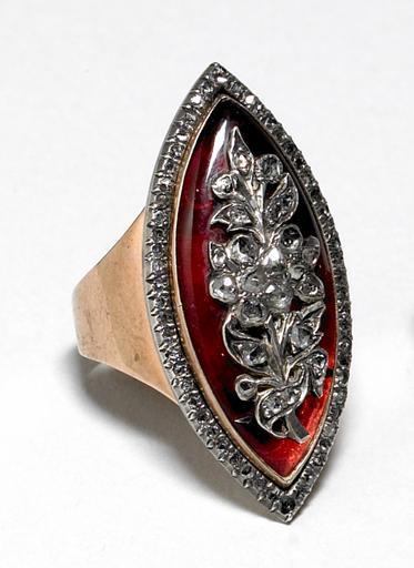 | Keywords: English - Ring with Floral Motif - Walters 571776 - Top (2).jpg In the late 18th century and into the 19th century marquise rings set with diamonds on dark blue or red enamel backgrounds became fashionable in Europe The oval marquise bezel like this ring and the rectangular shuttle-shaped bezel were the most popular shapes with diamonds set to imitate stars in the sky or floral sprays It was charactersitic to frame these rings with a border of diamond sparks set in silver mounts late Other date century 18 gold silver enamel diamond cm 3 33 1 75 accession number 57 1776 21927 Henry Walters Baltimore date and mode of acquisition unknown Laura F Delano New York date of acquisition unknown by gift Walters Art Museum Gift of Laura F Delano 1947 Jewelry - Ancient to Modern The Walters Art Gallery Baltimore 1979-1980 Bedazzled 5 000 Years of Jewelry from the Walters Art Museum Frist Center for the Visual Arts Nashville; The John and Mable Ringling Museum of Art Sarasota; The Walters Art Museum Baltimore 2006-2009 Bedazzled 5 000 Years of Jewelry El Paso Museum of Art El Paso 2010 place of origin England United Kingdom <gallery> File English - Ring with Floral Motif - Walters 571776 - Top jpg </gallery> Walters Art Museum license Jewellery in the Walters Art Museum Art of England Media contributed by the Walters Art Museum needs category review Media contributed by the Walters Art Museum needs artist update |