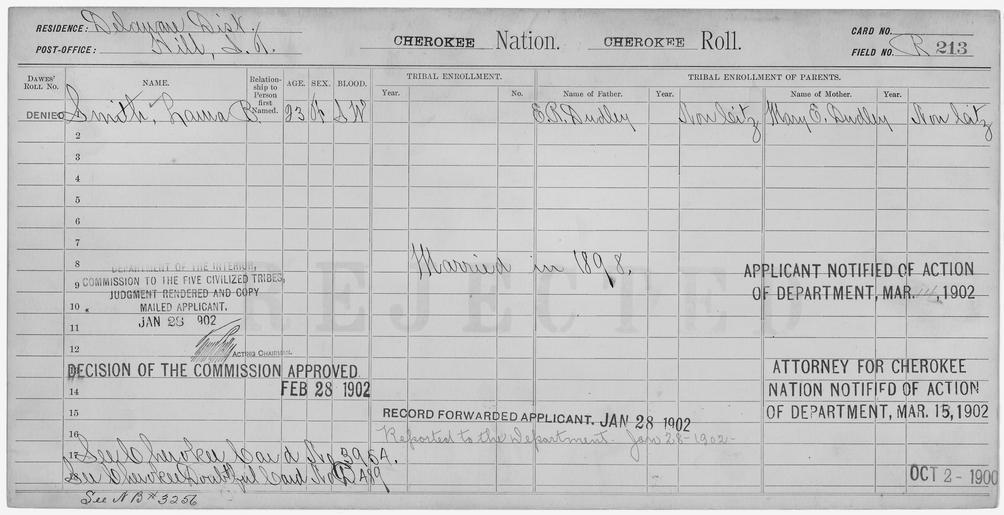 | Keywords: Enrollment for Cherokee Census Card R213 - NARA - 259276.tif Scope and content Name E R Dudley Type Parent Sex Male Name Mary E Dudley Type Parent Sex Female Name Laura B Smith Type Rejected Age 23 Sex Female Degree Indian Blood Intermarried White City of Residence Hill General notes 259276 Local identifier 75-53A-CHEROKEE R213 Department of the Interior Office of Indian Affairs Office of the Commissioner to the Five Civilized Tribes 1893 - 1914 NARA's Southwest Region Fort Worth NRFA 1400 John Burgess Drive Fort Worth TX 76140 Record group Record Group 75 Records of the Bureau of Indian Affairs 1793 - 1999 Record group ARC 404 Enrollment Cards compiled 1898 - 1914 Series ARC 251747 File unit File unit ARC Variant control numbers NAIL Control Number NRFF-75-53A-17818<br /> NAIL Control Number NRFF-75-53A-5767<br /> NAIL Control Number NRFF-75-53A-5777<br /> NAIL Control Number NRFF-75-53A-CHEROKEE R213 yes Other versions <gallery> File Enrollment_for_Cherokee_Census_Card_R213_-_NARA_-_259276 tif tif File Enrollment_for_Cherokee_Census_Card_R213_-_NARA_-_259276 jpg jpg </gallery> NARA-cooperation PD-USGov Cherokee census cards NARA TIF images with categorized JPGs |