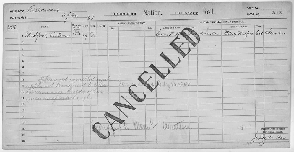 Keywords: Enrollment for Cherokee Census Card D12 - NARA - 251760.tif Local identifier 75-53A-CHEROKEE D12 Department of the Interior Office of Indian Affairs Office of the Commissioner to the Five Civilized Tribes 1893 - 1914 NARA's Southwest Region Fort Worth NRFA 1400 John Burgess Drive Fort Worth TX 76140 Record group Record Group 75 Records of the Bureau of Indian Affairs 1793 - 1999 Record group ARC 404 Enrollment Cards compiled 1898 - 1914 Series ARC 251747 Variant control numbers NAIL Control Number NRFF-75-53A-12981<br /> NAIL Control Number NRFF-75-53A-12982<br /> NAIL Control Number NRFF-75-53A-12983<br /> NAIL Control Number NRFF-75-53A-CHEROKEE D12 General notes Scope and content Name Andrew Medford Type Doubtful Age 19 Sex Male City of Residence Afton Name Mary Medford Type Parent Sex Female Name Servis Medford Type Parent Sex Male File unit File unit ARC yes <gallery> File Enrollment_for_Cherokee_Census_Card_D12_-_NARA_-_251760 tif tif File Enrollment_for_Cherokee_Census_Card_D12_-_NARA_-_251760 jpg jpg </gallery> NARA-cooperation PD-USGov Cherokee census cards NARA TIF images with categorized JPGs |