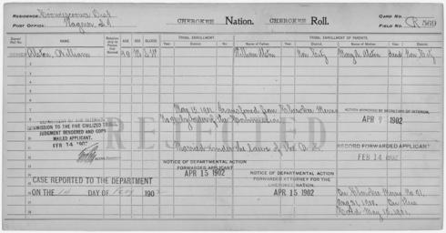 | Keywords: Enrollment for Cherokee Census Card R569 - NARA - 259632.tif Scope and content Name Mary A Alston Type Parent Sex Female Name William Alston Type Rejected Age 42 Sex Male Degree Indian Blood Intermarried White City of Residence Wagonerejected Name William Alston Type Parent Sex Male General notes 259632 Local identifier 75-53A-CHEROKEE R569 Department of the Interior Office of Indian Affairs Office of the Commissioner to the Five Civilized Tribes 1893 - 1914 NARA's Southwest Region Fort Worth NRFA 1400 John Burgess Drive Fort Worth TX 76140 Record group Record Group 75 Records of the Bureau of Indian Affairs 1793 - 1999 Record group ARC 404 Enrollment Cards compiled 1898 - 1914 Series ARC 251747 File unit File unit ARC Variant control numbers NAIL Control Number NRFF-75-53A-474<br /> NAIL Control Number NRFF-75-53A-475<br /> NAIL Control Number NRFF-75-53A-476<br /> NAIL Control Number NRFF-75-53A-CHEROKEE R569 yes Other versions <gallery> File Enrollment_for_Cherokee_Census_Card_R569_-_NARA_-_259632 tif tif File Enrollment_for_Cherokee_Census_Card_R569_-_NARA_-_259632 jpg jpg </gallery> NARA-cooperation PD-USGov Cherokee census cards NARA TIF images with categorized JPGs |