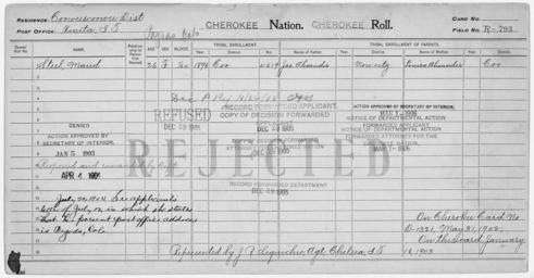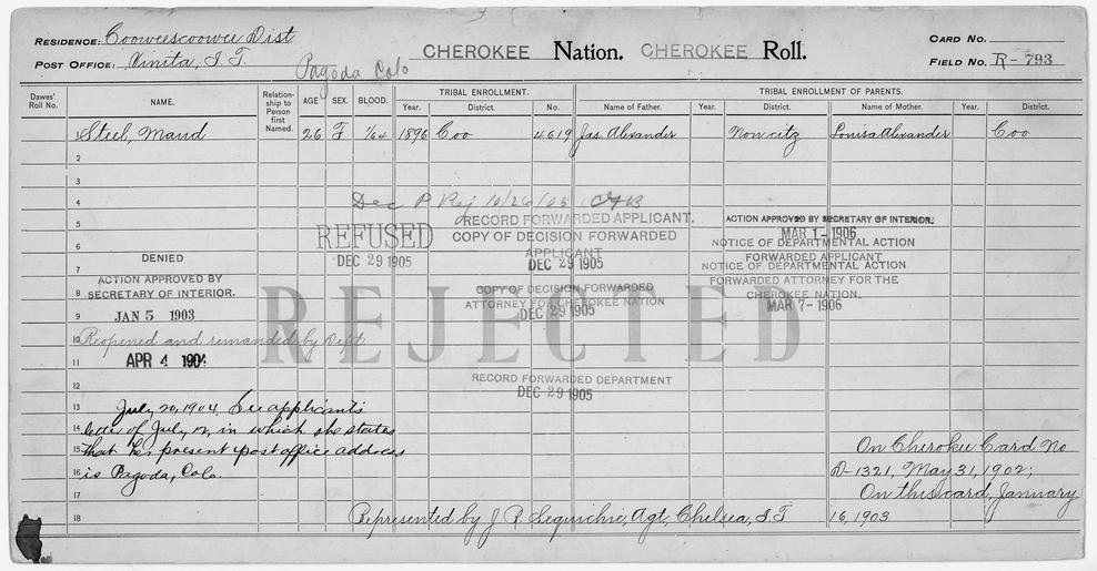 Keywords: Enrollment for Cherokee Census Card R793 - NARA - 259856.tif Scope and content Name James Alexander Type Parent Sex Male Name Louisa Alexander Type Parent Sex Female Name Maud Stell Type Rejected Age 26 Sex Female Degree Indian Blood 1/64 City of Residence Vinita General notes 259856 Local identifier 75-53A-CHEROKEE R793 Department of the Interior Office of Indian Affairs Office of the Commissioner to the Five Civilized Tribes 1893 - 1914 NARA's Southwest Region Fort Worth NRFA 1400 John Burgess Drive Fort Worth TX 76140 Record group Record Group 75 Records of the Bureau of Indian Affairs 1793 - 1999 Record group ARC 404 Enrollment Cards compiled 1898 - 1914 Series ARC 251747 File unit File unit ARC Variant control numbers NAIL Control Number NRFF-75-53A-18333<br /> NAIL Control Number NRFF-75-53A-357<br /> NAIL Control Number NRFF-75-53A-358<br /> NAIL Control Number NRFF-75-53A-CHEROKEE R793 yes Other versions <gallery> File Enrollment_for_Cherokee_Census_Card_R793_-_NARA_-_259856 tif tif File Enrollment_for_Cherokee_Census_Card_R793_-_NARA_-_259856 jpg jpg </gallery> NARA-cooperation PD-USGov Cherokee census cards NARA TIF images with categorized JPGs