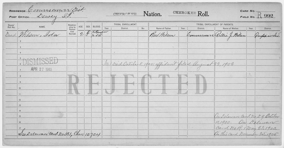 | Keywords: Enrollment for Cherokee Census Card R992 - NARA - 260055.tif Scope and content Name Ida Wilson Type Rejected Age 2 Sex Female Degree Indian Blood 1/2 City of Residence Dewey Name Reed Wilson Type Parent Sex Male Name Rollie J Wilson Type Parent Sex Female General notes 260055 Local identifier 75-53A-CHEROKEE R992 Department of the Interior Office of Indian Affairs Office of the Commissioner to the Five Civilized Tribes 1893 - 1914 NARA's Southwest Region Fort Worth NRFA 1400 John Burgess Drive Fort Worth TX 76140 Record group Record Group 75 Records of the Bureau of Indian Affairs 1793 - 1999 Record group ARC 404 Enrollment Cards compiled 1898 - 1914 Series ARC 251747 File unit File unit ARC Variant control numbers NAIL Control Number NRFF-75-53A-21916<br /> NAIL Control Number NRFF-75-53A-22025<br /> NAIL Control Number NRFF-75-53A-22037<br /> NAIL Control Number NRFF-75-53A-CHEROKEE R992 yes Other versions <gallery> File Enrollment_for_Cherokee_Census_Card_R992_-_NARA_-_260055 tif tif File Enrollment_for_Cherokee_Census_Card_R992_-_NARA_-_260055 jpg jpg </gallery> NARA-cooperation PD-USGov Cherokee census cards NARA TIF images with categorized JPGs |