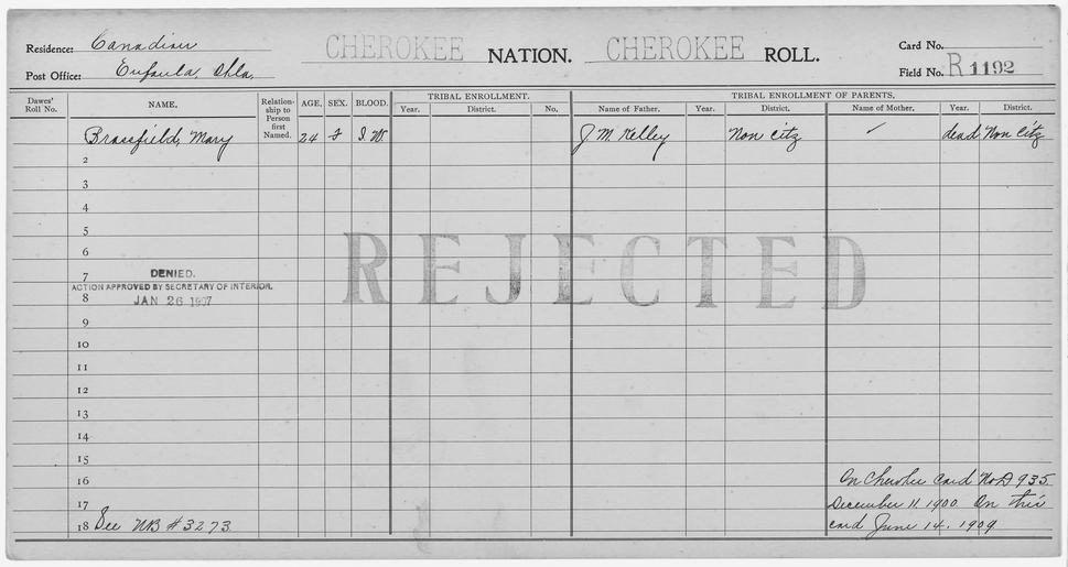 | Keywords: Enrollment for Cherokee Census Card R1192 - NARA - 260255.tif Scope and content Name Mary Brassfield Type Rejected Age 24 Sex Female Degree Indian Blood Intermarried White City of Residence Eufaula ok Name J M Kelley Type Parent Sex Male General notes 260255 Local identifier 75-53A-CHEROKEE R1192 Department of the Interior Office of Indian Affairs Office of the Commissioner to the Five Civilized Tribes 1893 - 1914 NARA's Southwest Region Fort Worth NRFA 1400 John Burgess Drive Fort Worth TX 76140 Record group Record Group 75 Records of the Bureau of Indian Affairs 1793 - 1999 Record group ARC 404 Enrollment Cards compiled 1898 - 1914 Series ARC 251747 File unit File unit ARC Variant control numbers NAIL Control Number NRFF-75-53A-10390<br /> NAIL Control Number NRFF-75-53A-2244<br /> NAIL Control Number NRFF-75-53A-CHEROKEE R1192 yes Other versions <gallery> File Enrollment_for_Cherokee_Census_Card_R1192_-_NARA_-_260255 tif tif File Enrollment_for_Cherokee_Census_Card_R1192_-_NARA_-_260255 jpg jpg </gallery> NARA-cooperation PD-USGov Cherokee census cards NARA TIF images with categorized JPGs |