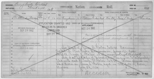 Keywords: Enrollment for Cherokee Census Card D32 - NARA - 251780.jpg Scope and content Name Nancy S Crittenden Type Doubtful Age 25 Sex Female Degree Indian Blood 1/16 City of Residence Westvill Name Nancy Forbes Type Parent Sex Female Name William Forbes Type Parent Sex Male General notes 251780 Local identifier 75-53A-CHEROKEE D32 Department of the Interior Office of Indian Affairs Office of the Commissioner to the Five Civilized Tribes 1893 - 1914 NARA's Southwest Region Fort Worth NRFA 1400 John Burgess Drive Fort Worth TX 76140 Record group Record Group 75 Records of the Bureau of Indian Affairs 1793 - 1999 Record group ARC 404 Enrollment Cards compiled 1898 - 1914 Series ARC 251747 File unit File unit ARC Variant control numbers NAIL Control Number NRFF-75-53A-4682<br /> NAIL Control Number NRFF-75-53A-6669<br /> NAIL Control Number NRFF-75-53A-6685<br /> NAIL Control Number NRFF-75-53A-CHEROKEE D32 Other versions <gallery> File Enrollment_for_Cherokee_Census_Card_D32_-_NARA_-_251780 tif tif File Enrollment_for_Cherokee_Census_Card_D32_-_NARA_-_251780 jpg jpg </gallery> NARA-cooperation PD-USGov Cherokee census cards |