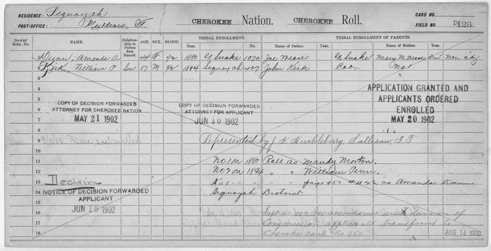 Keywords: Enrollment for Cherokee Census Card D126 - NARA - 251874.jpg Scope and content Name Amanda A Dunn Type Doubtful Age 44 Sex Female Degree Indian Blood 1/2 City of Residence Muldrow Name John Kirk Type Parent Sex Male Name William P Kirk Type Doubtful Age 17 Sex Male Degree Indian Blood 1/2 City of Residence Muldrow Name Joe Weaver Type Parent Sex Male Name Mary M Weaver Type Parent Sex Female General notes 251874 Local identifier 75-53A-CHEROKEE D126 Department of the Interior Office of Indian Affairs Office of the Commissioner to the Five Civilized Tribes 1893 - 1914 NARA's Southwest Region Fort Worth NRFA 1400 John Burgess Drive Fort Worth TX 76140 Record group Record Group 75 Records of the Bureau of Indian Affairs 1793 - 1999 Record group ARC 404 Enrollment Cards compiled 1898 - 1914 Series ARC 251747 File unit File unit ARC Variant control numbers NAIL Control Number NRFF-75-53A-10783<br /> NAIL Control Number NRFF-75-53A-10797<br /> NAIL Control Number NRFF-75-53A-20970<br /> NAIL Control Number NRFF-75-53A-20989<br /> NAIL Control Number NRFF-75-53A-5829<br /> NAIL Control Number NRFF-75-53A-CHEROKEE D126 Other versions <gallery> File Enrollment_for_Cherokee_Census_Card_D126_-_NARA_-_251874 tif tif File Enrollment_for_Cherokee_Census_Card_D126_-_NARA_-_251874 jpg jpg </gallery> NARA-cooperation PD-USGov Cherokee census cards |