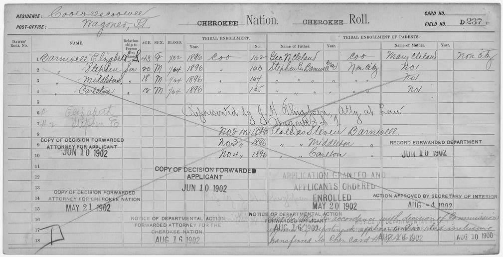 Keywords: Enrollment for Cherokee Census Card D237 - NARA - 251985.tif Local identifier 75-53A-CHEROKEE D237 Department of the Interior Office of Indian Affairs Office of the Commissioner to the Five Civilized Tribes 1893 - 1914 NARA's Southwest Region Fort Worth NRFA 1400 John Burgess Drive Fort Worth TX 76140 Record group Record Group 75 Records of the Bureau of Indian Affairs 1793 - 1999 Record group ARC 404 Enrollment Cards compiled 1898 - 1914 Series ARC 251747 Variant control numbers NAIL Control Number NRFF-75-53A-1114<br /> NAIL Control Number NRFF-75-53A-1115<br /> NAIL Control Number NRFF-75-53A-1116<br /> NAIL Control Number NRFF-75-53A-1117<br /> NAIL Control Number NRFF-75-53A-1118<br /> NAIL Control Number NRFF-75-53A-3883<br /> NAIL Control Number NRFF-75-53A-3886<br /> NAIL Control Number NRFF-75-53A-CHEROKEE D237 General notes Scope and content Name Carleton Barnwell Type Doubtful Age 12 Sex Male Degree Indian Blood 1/64 City of Residence Wagoner Name Elizabeth S Barnwell Type Doubtful Age 43 Sex Female Degree Indian Blood 1/32 City of Residence Wagoner Name Middleton Barnwell Type Doubtful Age 18 Sex Male Degree Indian Blood 1/64 City of Residence Wagoner Name Stephen Barnwell Type Doubtful Age 20 Sex Male Degree Indian Blood 1/64 City of Residence Wagoner Name Stephen E Barnwell Type Parent Sex Male Name George W Cleland Type Parent Sex Male Name Mary Cleland Type Parent Sex Female File unit File unit ARC yes <gallery> File Enrollment_for_Cherokee_Census_Card_D237_-_NARA_-_251985 tif tif File Enrollment_for_Cherokee_Census_Card_D237_-_NARA_-_251985 jpg jpg </gallery> NARA-cooperation PD-USGov Cherokee census cards NARA TIF images with categorized JPGs |