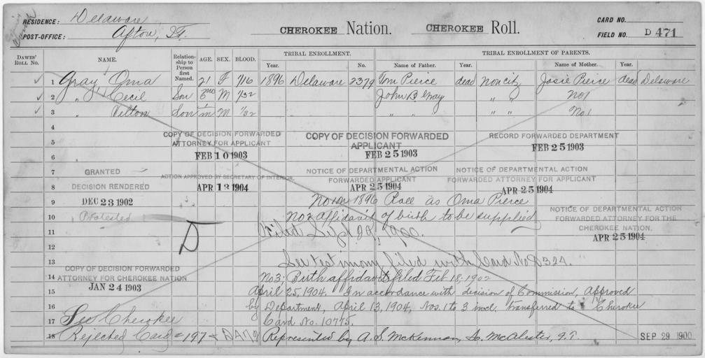 Keywords: Enrollment for Cherokee Census Card D471 - NARA - 252219.jpg Scope and content Name Oma Gray Type Doubtful Age 21 Sex Female Degree Indian Blood 1/16 Roll Number Not Reported Post Office Afton Name Cecil Gray Type Doubtful Age 1 Sex Male Degree Indian Blood 1/32 Roll Number Not Reported Post Office Afton Name Velton Gray Type Doubtful Age 1 Sex Male Degree Indian Blood 1/32 Roll Number Not Reported Post Office Afton Name John B Gray Type Parent Age Not Reported Sex Male Degree Indian Blood Not Reported Roll Number Not Reported Post Office Not Reported Name Tom Pierce Type Parent Age Not Reported Sex Male Degree Indian Blood Not Reported Roll Number Not Reported Post Office Not Reported Name Josie Pierce Type Parent Age Not Reported Sex Female Degree Indian Blood Not Reported Roll Number Not Reported Post Office Not Reported General notes 252219 Local identifier 75-53A-CHEROKEE D471 Department of the Interior Office of Indian Affairs Office of the Commissioner to the Five Civilized Tribes 1893 - 1914 NARA's Southwest Region Fort Worth NRFA 1400 John Burgess Drive Fort Worth TX 76140 Record group Record Group 75 Records of the Bureau of Indian Affairs 1793 - 1999 Record group ARC 404 Enrollment Cards compiled 1898 - 1914 Series ARC 251747 File unit File unit ARC Variant control numbers NAIL Control Number NRFF-75-53A-53733<br /> NAIL Control Number NRFF-75-53A-53734<br /> NAIL Control Number NRFF-75-53A-53735<br /> NAIL Control Number NRFF-75-53A-53736<br /> NAIL Control Number NRFF-75-53A-53737<br /> NAIL Control Number NRFF-75-53A-53738<br /> NAIL Control Number NRFF-75-53A-CHEROKEE D471 Other versions <gallery> File Enrollment_for_Cherokee_Census_Card_D471_-_NARA_-_252219 tif tif File Enrollment_for_Cherokee_Census_Card_D471_-_NARA_-_252219 jpg jpg </gallery> NARA-cooperation PD-USGov Cherokee census cards |
