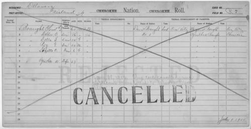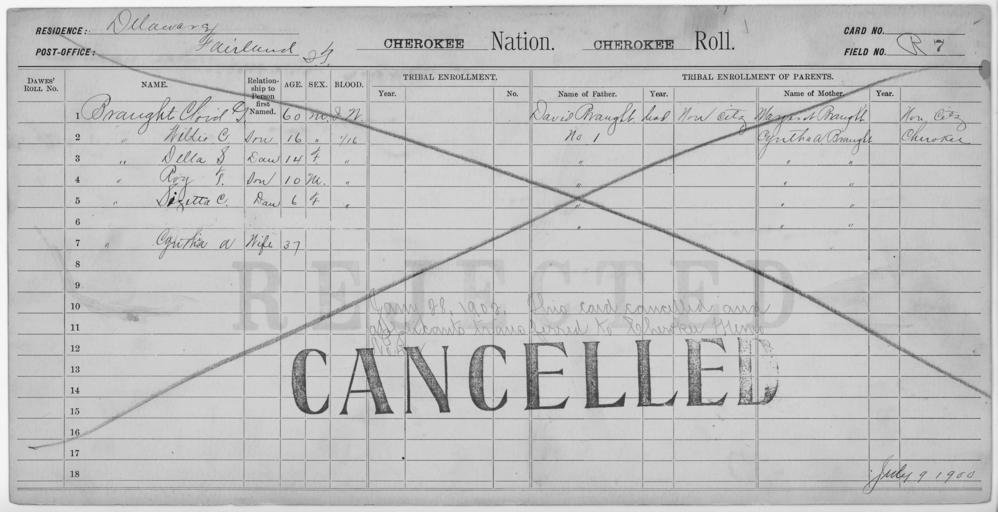 Keywords: Enrollment for Cherokee Census Card R7 - NARA - 259070.jpg Scope and content Name Cloud G Braught Type Rejected Age 60 Sex Male Degree Indian Blood 1/16 City of Residence Fairland Name Cynthia A Braught Type Rejected Age 37 City of Residence Fairland Name Cynthia A Braught Type Parent Sex Female Name David Braught Type Parent Sex Male Name Della S Braught Type Rejected Age 14 Sex Female Degree Indian Blood 1/16 City of Residence Fairland Name Margaret Braught Type Parent Sex Female Name Roy T Braught Type Rejected Age 10 Sex Male Degree Indian Blood 1/16 City of Residence Fairland Name Sizetta C Braught Type Rejected Age 6 Sex Female Degree Indian Blood 1/16 City of Residence Fairland Name Willie C Braught Type Rejected Age 16 Sex Male Degree Indian Blood 1/16 City of Residence Fairland General notes 259070 Local identifier 75-53A-CHEROKEE R7 Department of the Interior Office of Indian Affairs Office of the Commissioner to the Five Civilized Tribes 1893 - 1914 NARA's Southwest Region Fort Worth NRFA 1400 John Burgess Drive Fort Worth TX 76140 Record group Record Group 75 Records of the Bureau of Indian Affairs 1793 - 1999 Record group ARC 404 Enrollment Cards compiled 1898 - 1914 Series ARC 251747 File unit File unit ARC Variant control numbers NAIL Control Number NRFF-75-53A-2258<br /> NAIL Control Number NRFF-75-53A-2259<br /> NAIL Control Number NRFF-75-53A-2260<br /> NAIL Control Number NRFF-75-53A-2261<br /> NAIL Control Number NRFF-75-53A-2262<br /> NAIL Control Number NRFF-75-53A-2263<br /> NAIL Control Number NRFF-75-53A-2264<br /> NAIL Control Number NRFF-75-53A-2265<br /> NAIL Control Number NRFF-75-53A-2266<br /> NAIL Control Number NRFF-75-53A-CHEROKEE R7 Other versions <gallery> File Enrollment_for_Cherokee_Census_Card_R7_-_NARA_-_259070 tif tif File Enrollment_for_Cherokee_Census_Card_R7_-_NARA_-_259070 jpg jpg </gallery> NARA-cooperation PD-USGov Cherokee census cards