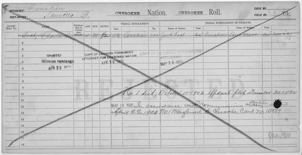 Keywords: Enrollment for Cherokee Census Card R75 - NARA - 259138.jpg Scope and content Name Charles L Fool Type Rejected Age 4 Sex Male Degree Indian Blood 1/2 City of Residence Starvilla Name Jack Fool Type Parent Sex Male Name Lina B Weaver Type Parent Sex Female General notes 259138 Local identifier 75-53A-CHEROKEE R75 Department of the Interior Office of Indian Affairs Office of the Commissioner to the Five Civilized Tribes 1893 - 1914 NARA's Southwest Region Fort Worth NRFA 1400 John Burgess Drive Fort Worth TX 76140 Record group Record Group 75 Records of the Bureau of Indian Affairs 1793 - 1999 Record group ARC 404 Enrollment Cards compiled 1898 - 1914 Series ARC 251747 File unit File unit ARC Variant control numbers NAIL Control Number NRFF-75-53A-20980<br /> NAIL Control Number NRFF-75-53A-6654<br /> NAIL Control Number NRFF-75-53A-6655<br /> NAIL Control Number NRFF-75-53A-CHEROKEE R75 Other versions <gallery> File Enrollment_for_Cherokee_Census_Card_R75_-_NARA_-_259138 tif tif File Enrollment_for_Cherokee_Census_Card_R75_-_NARA_-_259138 jpg jpg </gallery> NARA-cooperation PD-USGov Cherokee census cards |
