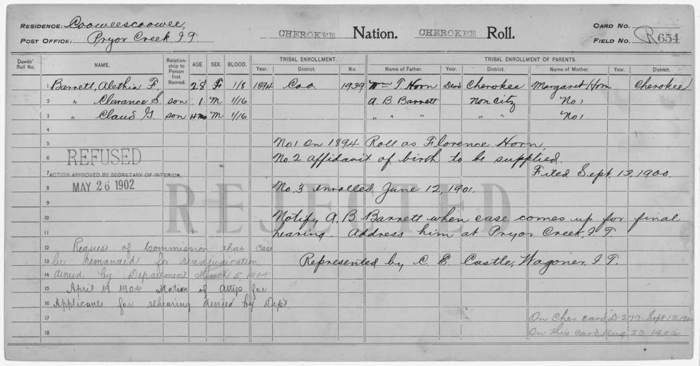Keywords: Enrollment for Cherokee Census Card R654 - NARA - 259717.jpg Scope and content Name A B Barrett Type Parent Sex Male Name Alethia F Barrett Type Rejected Age 28 Sex Female Degree Indian Blood 1/8 City of Residence Pryor Creek Name Clarance S Barrett Type Rejected Age 1 Sex Male Degree Indian Blood 1/16 City of Residence Pryor Creek Name Claud G Barrett Type Rejected Age 1 Sex Male Degree Indian Blood 1/16 City of Residence Pryor Creek Name Margaret Horn Type Parent Sex Female Name William T Horn Type Parent Sex Male General notes 259717 Local identifier 75-53A-CHEROKEE R654 Department of the Interior Office of Indian Affairs Office of the Commissioner to the Five Civilized Tribes 1893 - 1914 NARA's Southwest Region Fort Worth NRFA 1400 John Burgess Drive Fort Worth TX 76140 Record group Record Group 75 Records of the Bureau of Indian Affairs 1793 - 1999 Record group ARC 404 Enrollment Cards compiled 1898 - 1914 Series ARC 251747 File unit File unit ARC Variant control numbers NAIL Control Number NRFF-75-53A-1125<br /> NAIL Control Number NRFF-75-53A-1126<br /> NAIL Control Number NRFF-75-53A-1127<br /> NAIL Control Number NRFF-75-53A-1128<br /> NAIL Control Number NRFF-75-53A-9167<br /> NAIL Control Number NRFF-75-53A-9185<br /> NAIL Control Number NRFF-75-53A-CHEROKEE R654 Other versions <gallery> File Enrollment_for_Cherokee_Census_Card_R654_-_NARA_-_259717 tif tif File Enrollment_for_Cherokee_Census_Card_R654_-_NARA_-_259717 jpg jpg </gallery> NARA-cooperation PD-USGov Cherokee census cards |