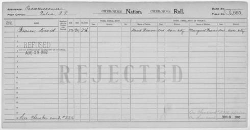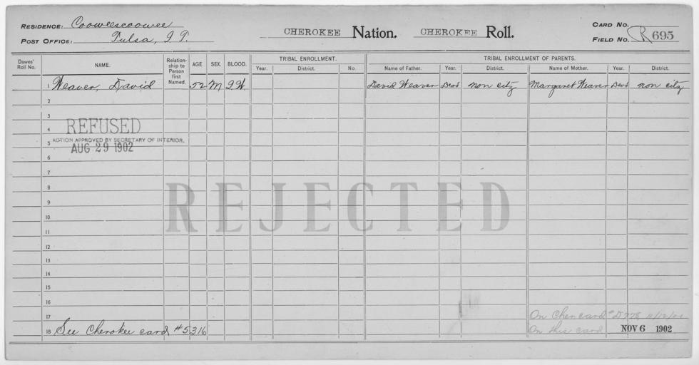 Keywords: Enrollment for Cherokee Census Card R695 - NARA - 259758.jpg Scope and content Name David Weaver Type Rejected Age 52 Sex Male Degree Indian Blood Intermarried White City of Residence Tulsa Name David Weaver Type Parent Sex Male Name Margaret Weaver Type Parent Sex Female General notes 259758 Local identifier 75-53A-CHEROKEE R695 Department of the Interior Office of Indian Affairs Office of the Commissioner to the Five Civilized Tribes 1893 - 1914 NARA's Southwest Region Fort Worth NRFA 1400 John Burgess Drive Fort Worth TX 76140 Record group Record Group 75 Records of the Bureau of Indian Affairs 1793 - 1999 Record group ARC 404 Enrollment Cards compiled 1898 - 1914 Series ARC 251747 File unit File unit ARC Variant control numbers NAIL Control Number NRFF-75-53A-20958<br /> NAIL Control Number NRFF-75-53A-20959<br /> NAIL Control Number NRFF-75-53A-20984<br /> NAIL Control Number NRFF-75-53A-CHEROKEE R695 Other versions <gallery> File Enrollment_for_Cherokee_Census_Card_R695_-_NARA_-_259758 tif tif File Enrollment_for_Cherokee_Census_Card_R695_-_NARA_-_259758 jpg jpg </gallery> NARA-cooperation PD-USGov Cherokee census cards |