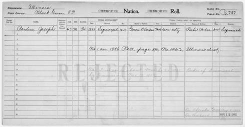 | Keywords: Enrollment for Cherokee Census Card R747 - NARA - 259810.jpg Scope and content Name Green B Perdue Type Parent Sex Male Name Joseph Perdue Type Rejected Age 63 Sex Male Degree Indian Blood 1/4 City of Residence Black Gum Name Rachel Perdue Type Parent Sex Female General notes 259810 Local identifier 75-53A-CHEROKEE R747 Department of the Interior Office of Indian Affairs Office of the Commissioner to the Five Civilized Tribes 1893 - 1914 NARA's Southwest Region Fort Worth NRFA 1400 John Burgess Drive Fort Worth TX 76140 Record group Record Group 75 Records of the Bureau of Indian Affairs 1793 - 1999 Record group ARC 404 Enrollment Cards compiled 1898 - 1914 Series ARC 251747 File unit File unit ARC Variant control numbers NAIL Control Number NRFF-75-53A-14870<br /> NAIL Control Number NRFF-75-53A-14873<br /> NAIL Control Number NRFF-75-53A-14877<br /> NAIL Control Number NRFF-75-53A-CHEROKEE R747 Other versions <gallery> File Enrollment_for_Cherokee_Census_Card_R747_-_NARA_-_259810 tif tif File Enrollment_for_Cherokee_Census_Card_R747_-_NARA_-_259810 jpg jpg </gallery> NARA-cooperation PD-USGov Cherokee census cards |